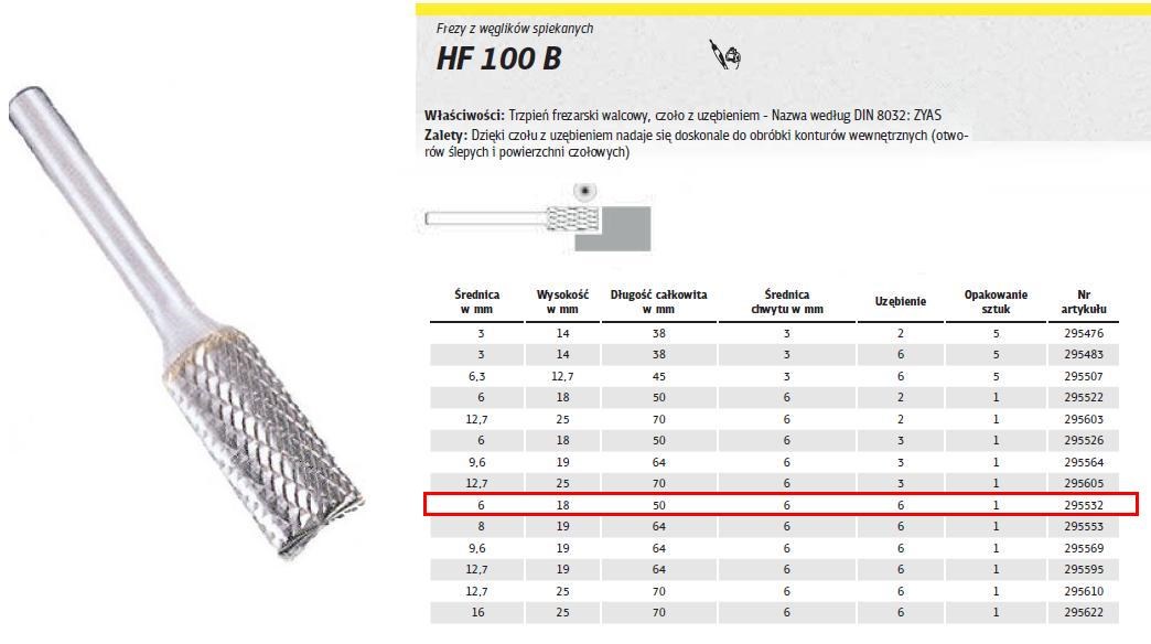 K.FREZ Z WĘG.SPIEKA.HF 100 B /6mm/532 WALEC FI=6x18mm, trzpień 6mm, TYP ZYAS