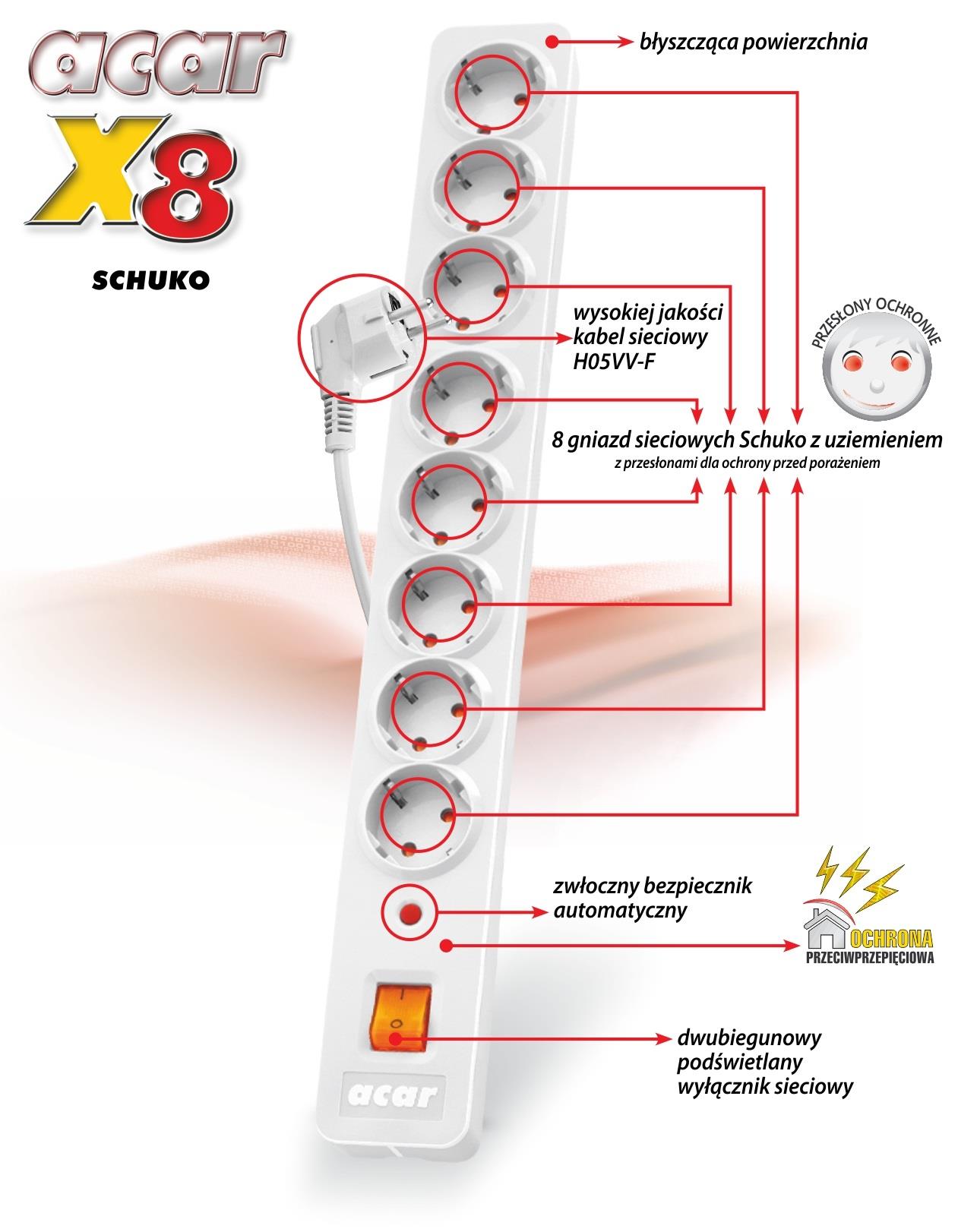 Listwa przeciwprzepięciowa Acar X8 Schuko 3,0m biała