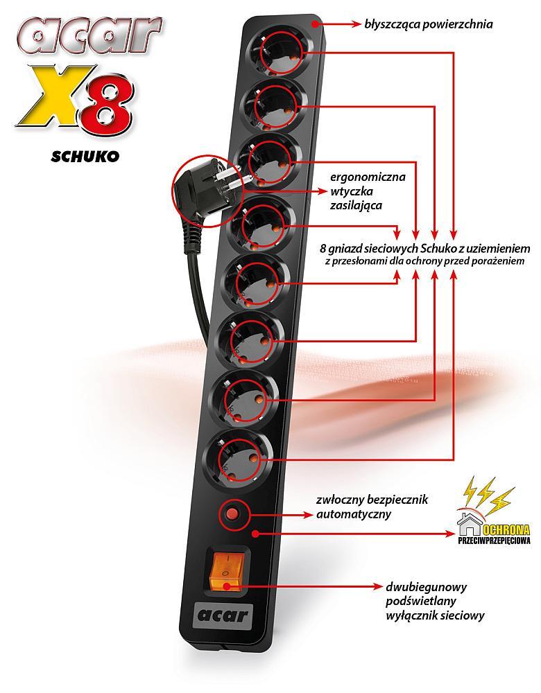 Listwa przeciwprzepięciowa Acar X8 Schuko 5,0m szara